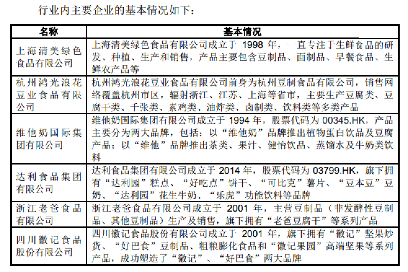 豆制品行业竞争激烈,集中度低。对祖名豆制品生鲜豆制品产品来说,其主要竞争对手为上海清美绿色食品有限公司、杭州鸿光浪花豆业食品有限公司等;植物蛋白饮品主要竞争对手为维他奶国际集团有限公司、达利食品集团有限公司、上海清美绿色食品有限公司、杭州鸿光浪花豆业食品有限公司等;休闲豆制品主要的竞争对手为浙江老爸食品有限公司、四川徽记食品股份有限公司等。