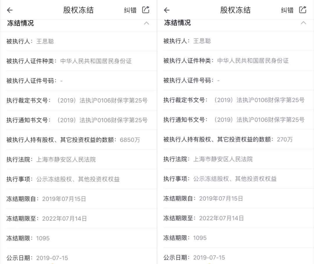 此次,王思聪共计7120万元股权被冻结,意味着王思聪持有两家公司的股权全部被冻结。