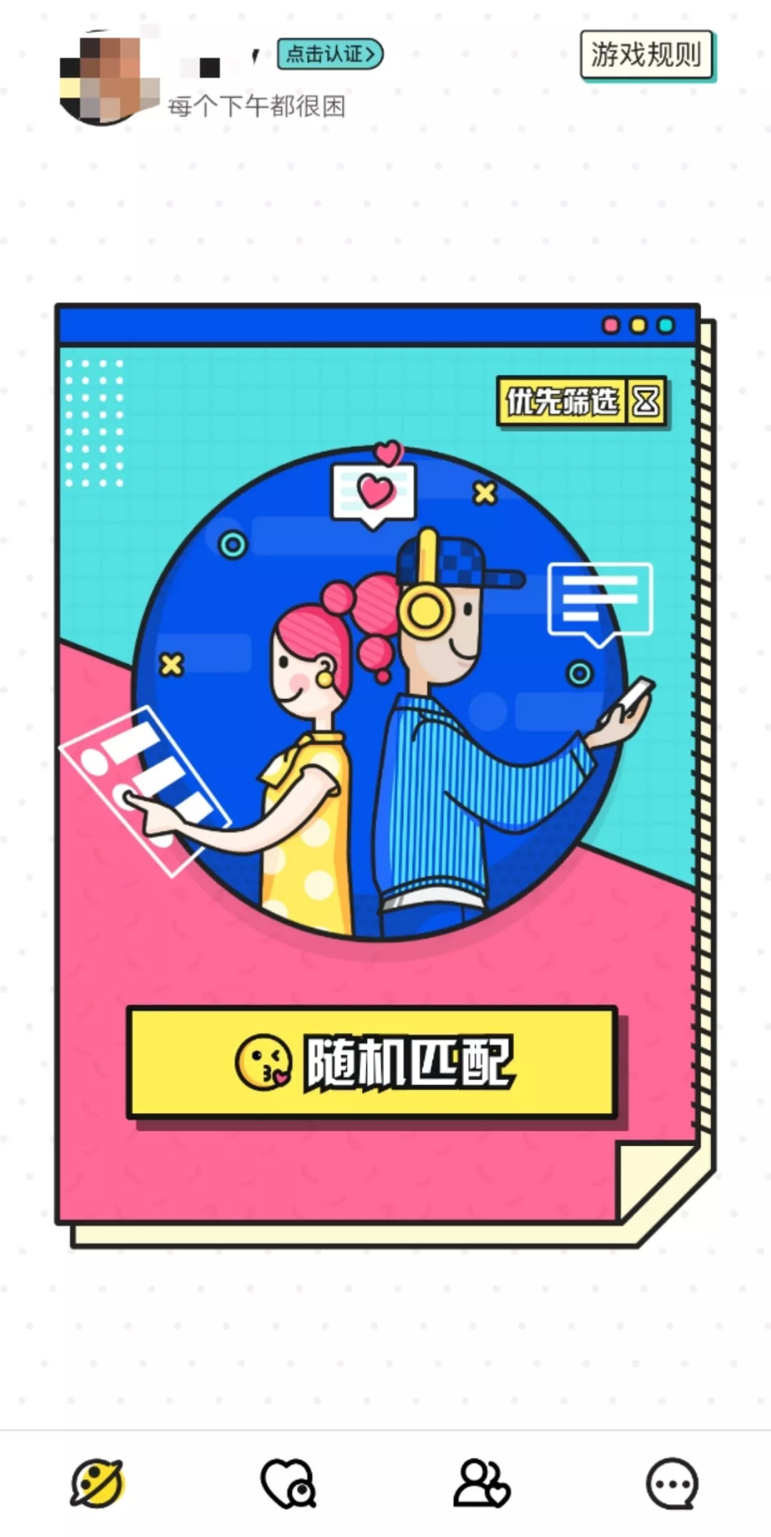 “随机匹配”玩法类似线上版非诚勿扰,需要先选心动对象。匹配标准为2男1女。匹配前,玩家可筛选用户年龄和距离。玩家匹配进入一个房间后,分女生提问、男生提问、好感互动三个环节进行,完成全部环节后才能进行私聊。