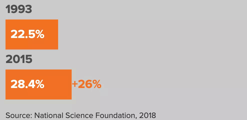 1993年和2015年相比,美国从事科学与工程职业的女性比例