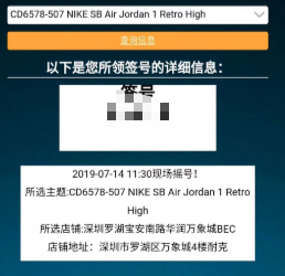 几天前,正在公司加班的大元(网名),在朋友圈里晒出了几张耐克限量款发售的签号图,并配上了这段文字。他告诉懂懂笔记,本来当天(周日)在深圳罗湖万象城耐克店,有一场现场抽签的活动。当他兴致勃勃拿到一双AJ1 Retro High限量款的签号之后,却突然接到部门领导通知,要求紧急回公司加班。