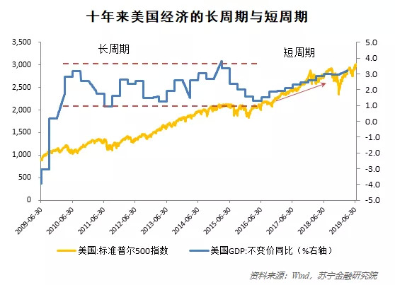 从长周期看,美国经济自十年前的“大衰退”以来,一直处于复苏周期中,而从短周期看,自2016年以来减税等政策刺激导致美国GDP增速持续攀升,资本市场积累了一定规模的资产价格泡沫。在这样的泡沫环境下,全球却依然进入了降息周期。