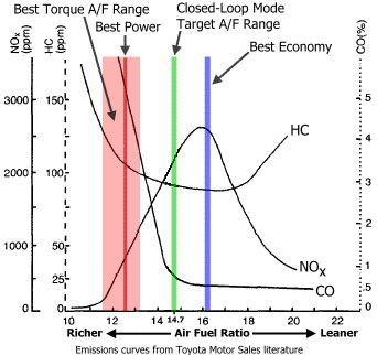 而我们减少汽油的喷射量,让气缸里处于“空气过量”的状态又会如何?大量的实验证明,当气缸里的空燃比达到16.2的时候,发动机的油耗指标降到最低。减少汽油的喷射量,空燃比达到18的时候,尾气最干净,环保成绩最高!(事实上某些“国6A”发动机就是在“国5”发动机基础上改写电脑程序,强行让发动机一直在空燃比18工作而已,当然,动力性能差很多)