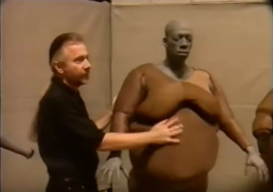 瑞克·贝克精心打造的“肥肉盔甲”,由硅胶制作而成,其中注入纤维与水,形成运动过程的晃动,同时,为了营造真实的松弛感,他还特地拿当地一个19岁的胖小伙打了样。