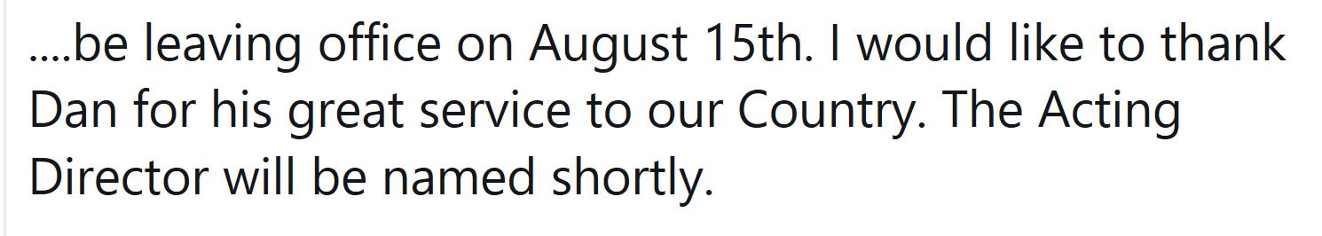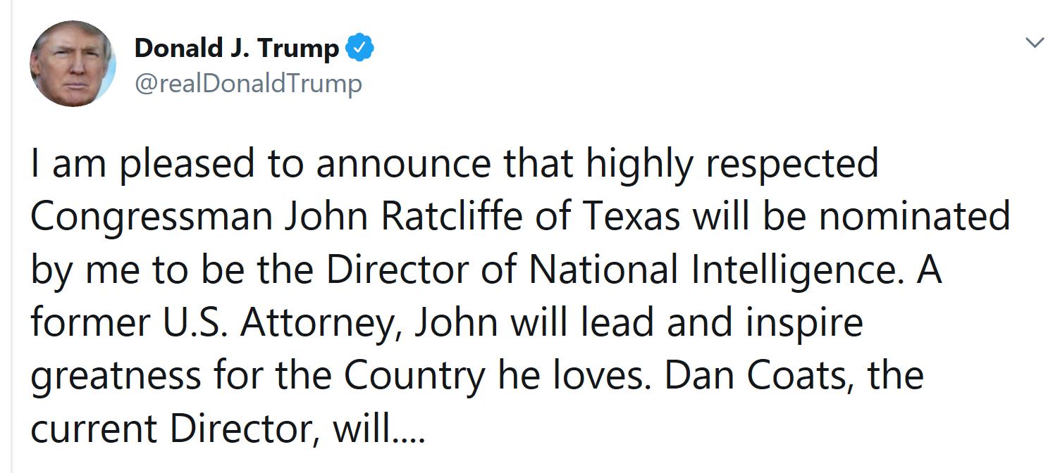 特朗普在推特上表示,科茨将于8月15日辞职,他将提名德克萨斯州国会议员约翰·拉特克里夫(John Ratcliffe)接替科茨。特朗普表示,拉特克里夫将领导并“激励他所热爱的国家实现伟大”。他同时感谢了丹·科茨为国家的服务。