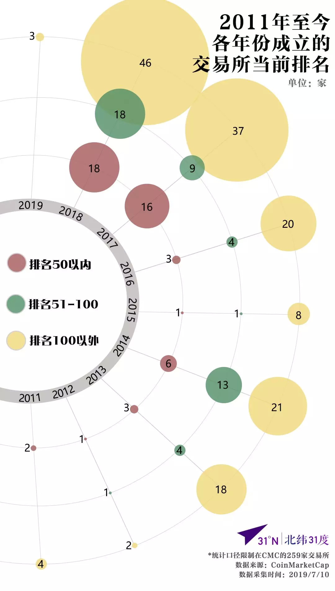 从CoinMarketCap的数据来看,基本上,每年新增交易所的数量都在攀升,但绝大多数仍然徘徊于100名之外。
