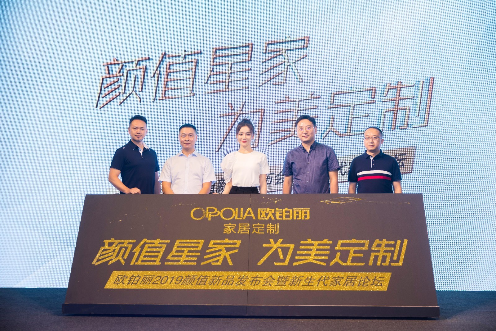 随后,袁姗姗作为欧铂丽特邀星家体验官,与欧铂丽营销事业部总经理张小满先生、集团家居产品研发中心副总经理邵佳先生、首席品牌总监沈艳鲲先生、欧铂丽运营支持部总监卞海波先生一同倒沙,共同点亮“颜值星家,为美定制”,宣布欧铂丽2019颜值新品正式发布。
