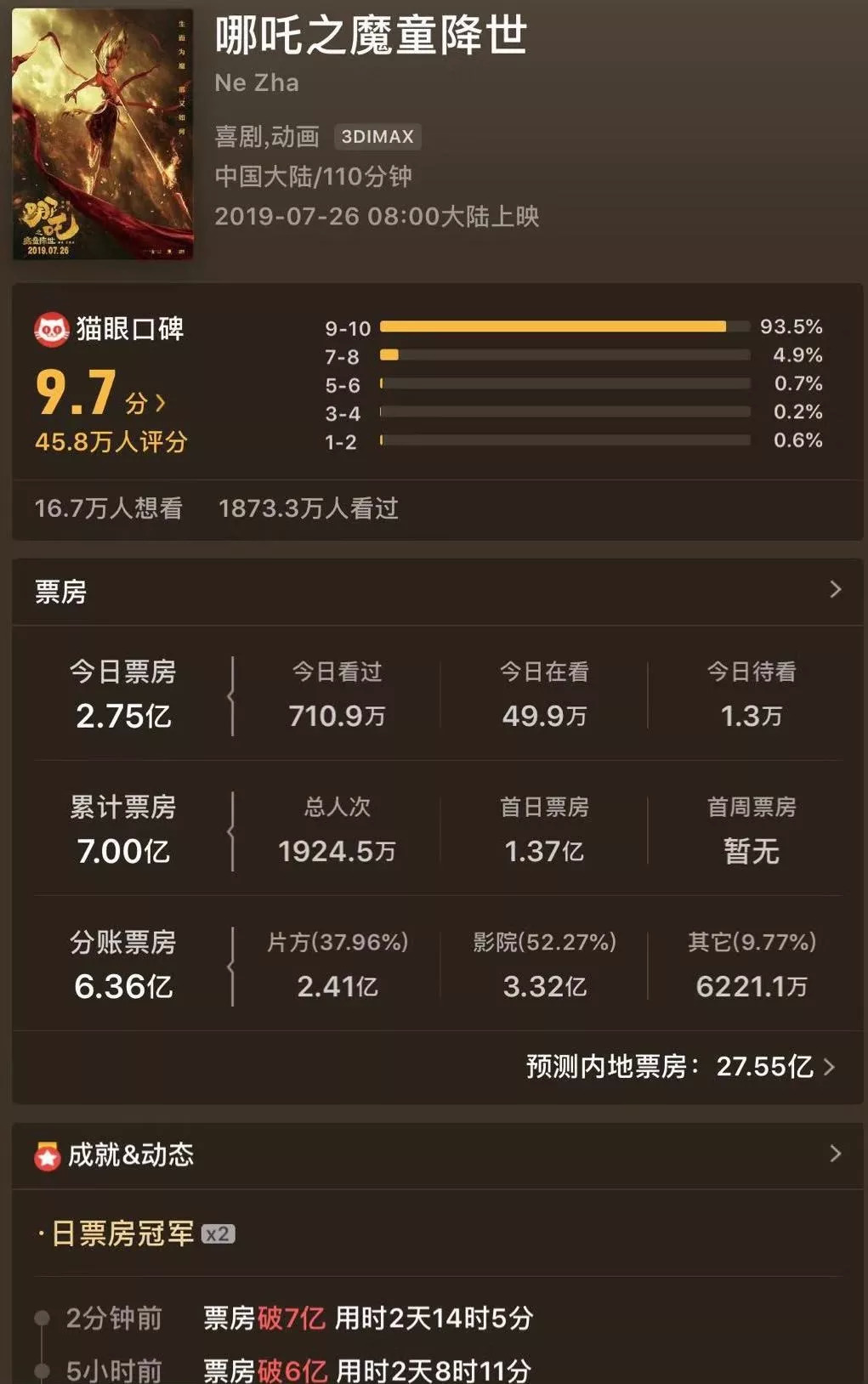 7月28日《哪吒》累计票房超过7亿元,用时62小时5分;