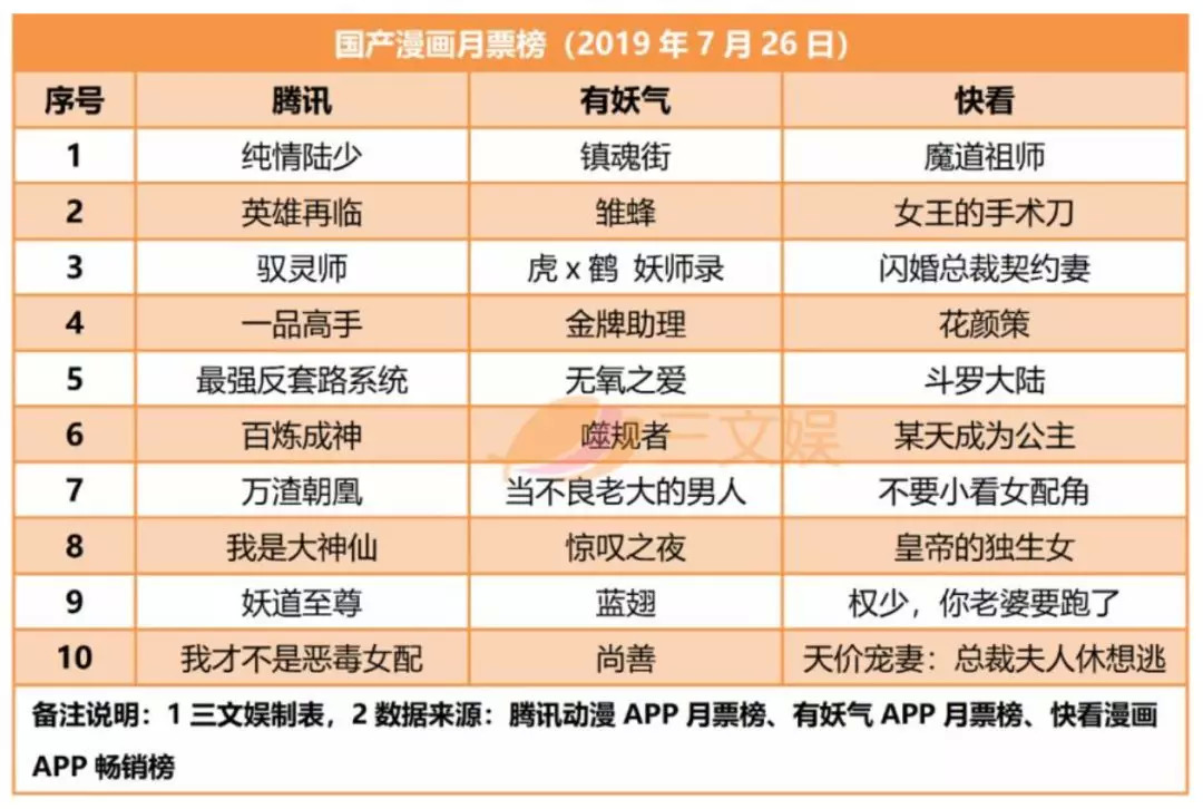 国产漫画方面,截止至2019年7月26日,腾讯动漫APP漫画板块的周月票榜共有七部新晋榜单作品出现。上周,由博易创为出品的《纯情陆少》登顶月票榜,这部漫画改编自今歌的小说《纯情陆少火辣辣》,讲述了女扮男装的陆丁宁与宗继泽之间的爱情故事。周月票数为47775票。
