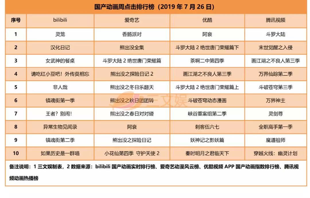 B站国产动画方面,截止至2019年7月26日,《灵笼》以1082472分的综合得分蝉联榜首。上周共有三部新晋榜单作品出现。
