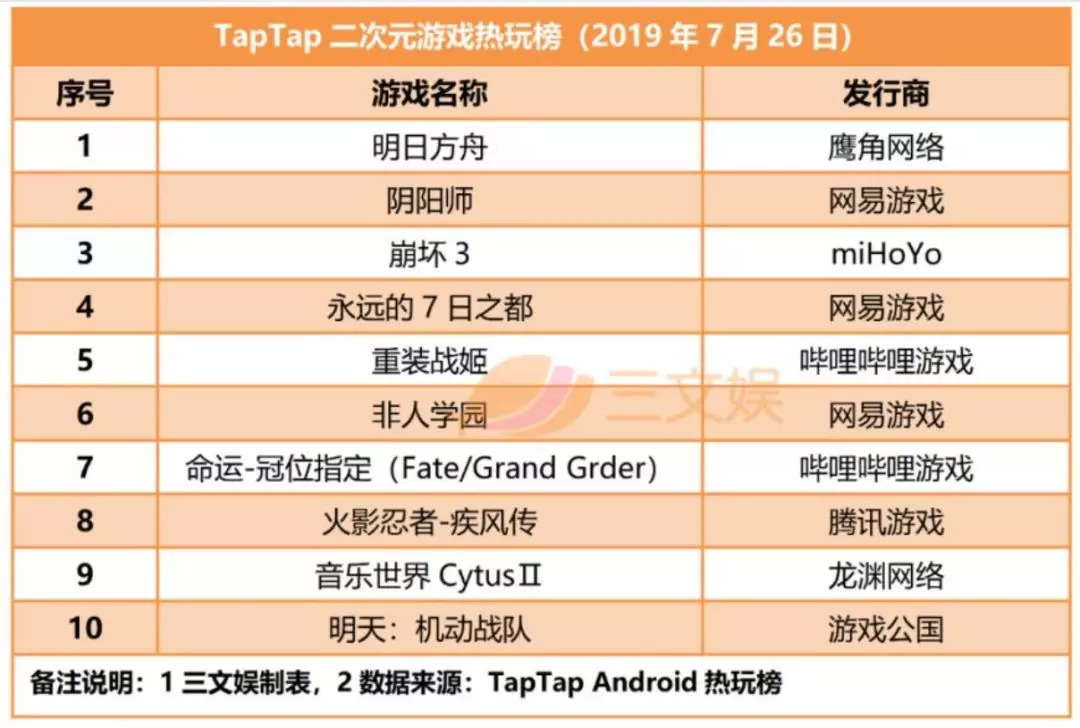 在TapTap Android二次元类游戏热玩榜方面,由鹰角网络发行的战术策略类游戏《明日方舟》位居第一,截止至7月26日,已有338万人安装,240万人关注。