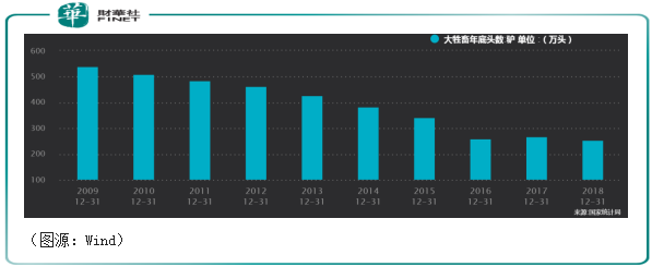 Wind数据显示,1996年中国有944.4万头驴,到了2009年数量锐减了将近一半,为540.4万头,此后逐年减少至2016年的259.3万头,2017年稍微回升,但到了2018年底又减少至253.28万头。