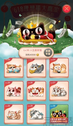 比如在去年的双11活动中,与好友PK赢能量一度也增强了淘宝的社交与娱乐属性。而更为典型的是在今年618期间,淘宝App推出“合猫猫”活动,在时限内用户凭借已解锁的猫猫等级,可分两次参与瓜分1亿及2亿元红包,猫的等级越高能分到的红包就越多,若是成功在这段时间内集齐12只30级的猫,还能额外再抽取全年大礼包。
