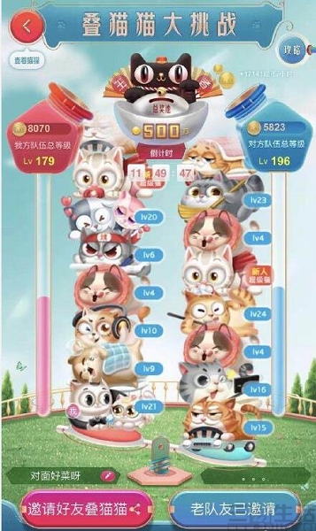 在此次活动中用户很快发现,仅凭自己日常清任务并不足以集齐12只30级的猫,而获取必要素材最为高效的方式,就是拉人组队,系统会随机选出两个战队进行“叠猫猫”比拼,人数越多猫等级越高的战队越有可能取得胜利,并获得更多的奖励。这也让原本是各买各的的购物活动,一时间就变成了拼人缘的团战大副本。