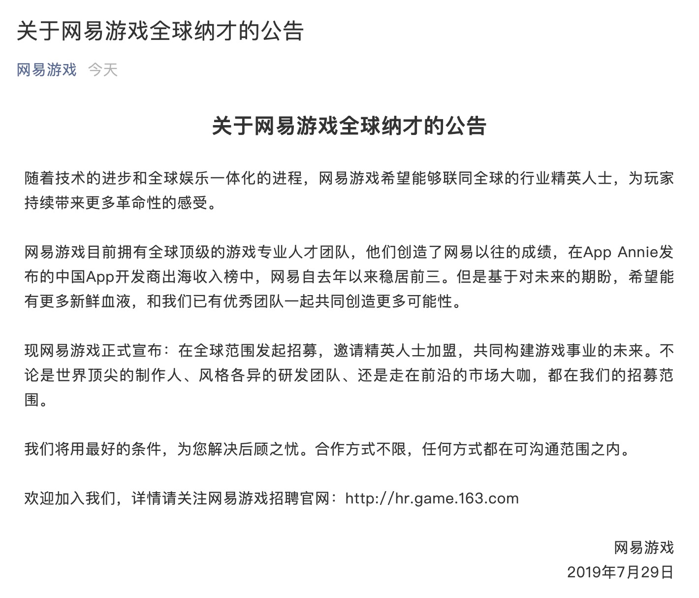 7月29日,针对网易游戏裁员10%的新闻,网易游戏通过官网微信号发表了《关于网易游戏全球纳才的公告》,暗指裁员不属实。