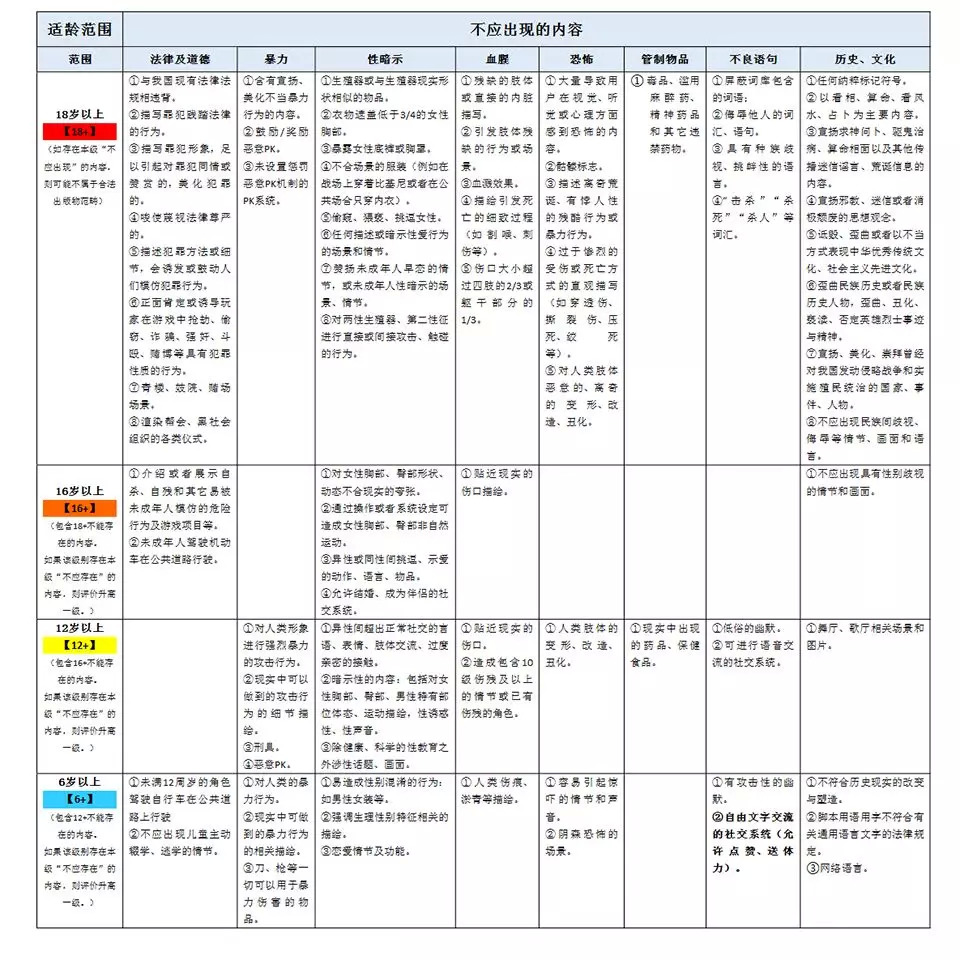 这是对已经通过审核、能够正常发行的游戏进行的二次分类。从细则中也能发现即使是最高的18+等级,反而有更多的细则描述,并不会出现没有内容限制的作品。
