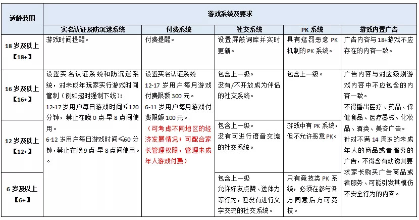 从“游戏适龄提示”具体细则来看,包括血腥、文化等游戏内容区分到广告、社交系统、付费等多个维度都有标准划分,也包括了对此前各家公司正在应用的“防沉迷系统”进行了规范。