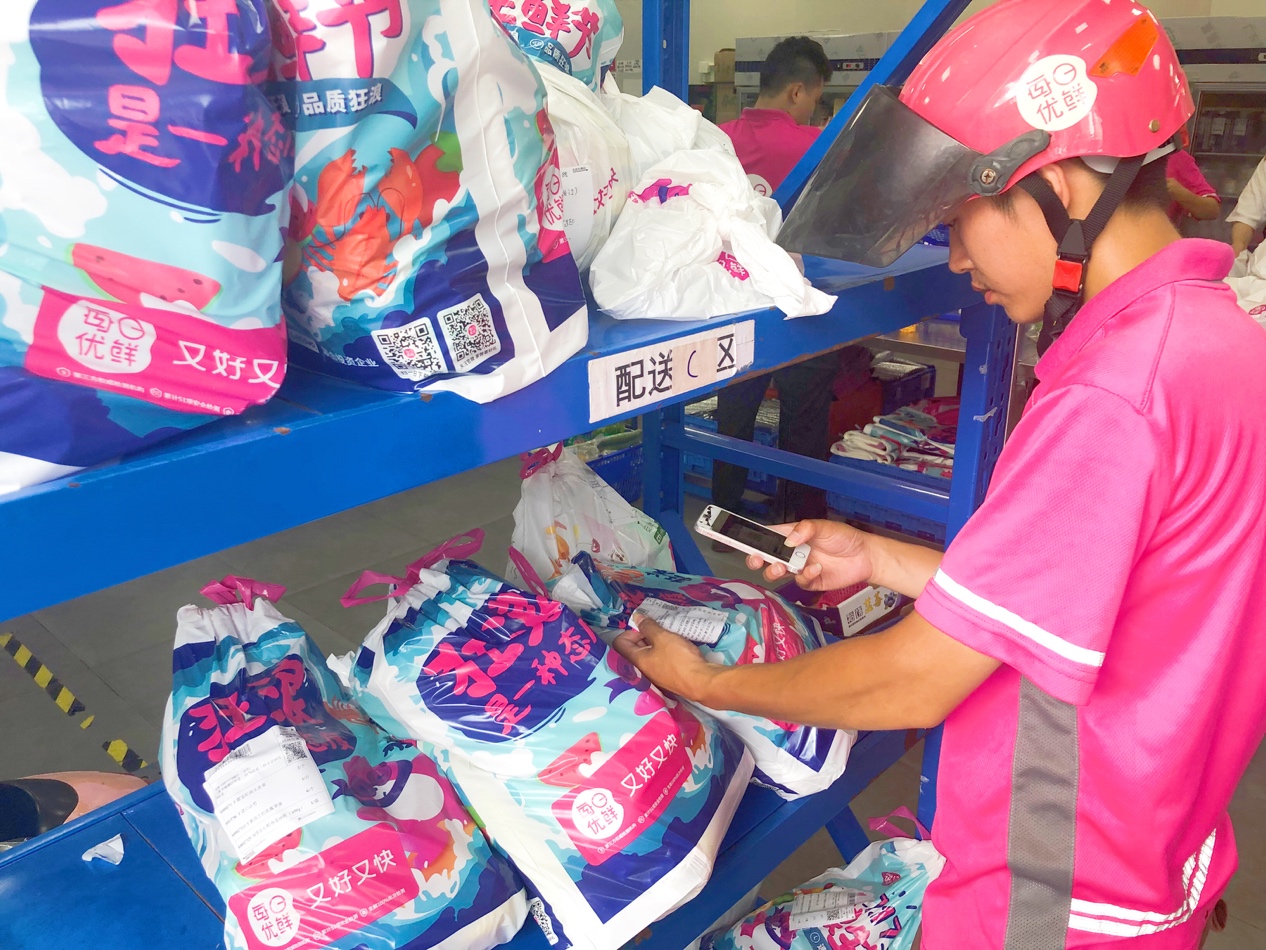 要完成一次“1小时达”的订单,每日优鲜前置仓内需要调动至少三个工种的工作人员:仓库管理员确定库存、区域温度,分拣员接单、取单、打包,配送员在门口的配送区取货、送货。若订单内涉及小红杯咖啡及海产生鲜,前置仓内还有两名咖啡师及海产管理员随时关注商品状态。