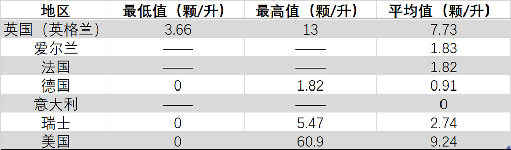 按世界卫生组织(WHO)2012年建议的每人每天5g盐摄取量标准,世界各地每人每年因为食用不同的食盐而可能吃下的微塑料颗粒数量如下[12]: