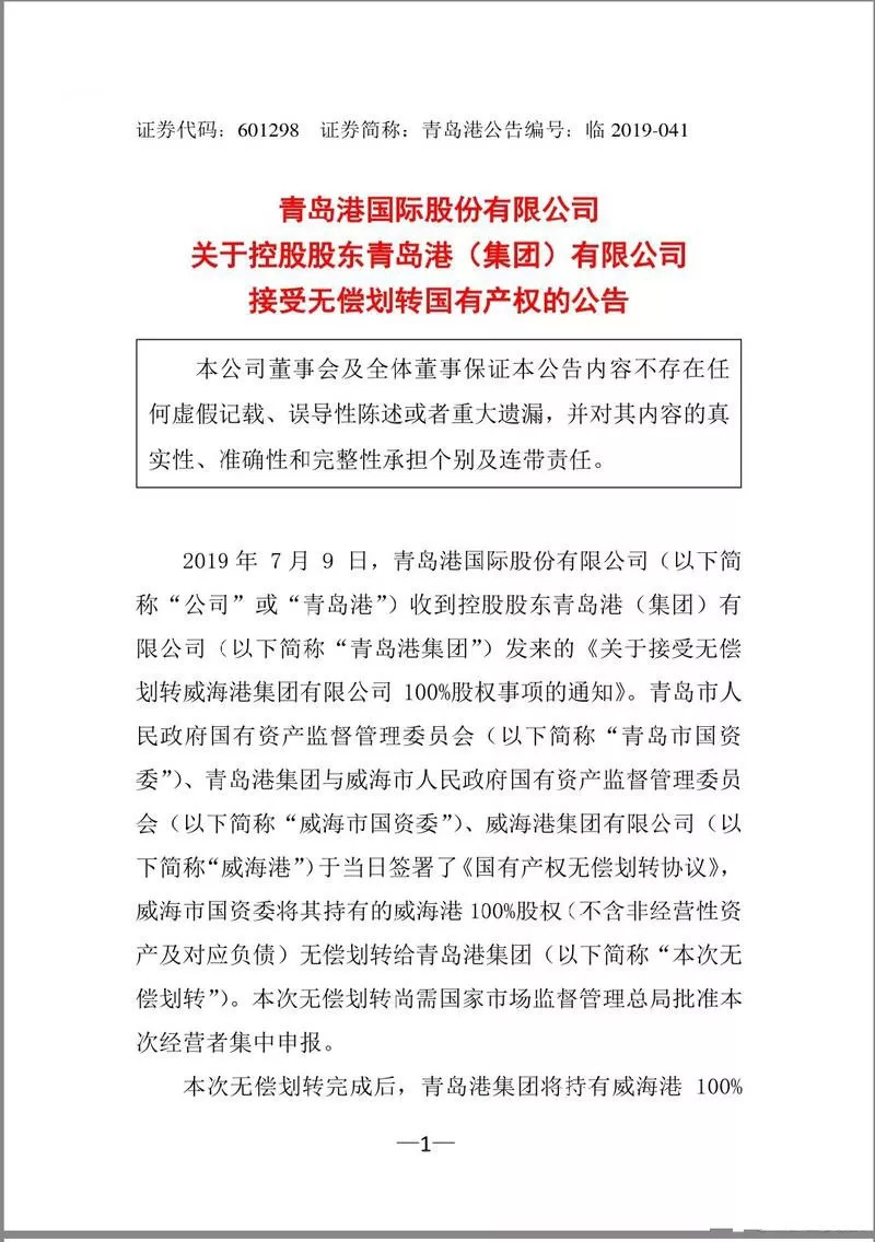 2019年7月9日晚间,威海港100%股权无偿划转至青岛港后,标志着山东省港口整合第二步已基本完成,港口进入深度整合期。