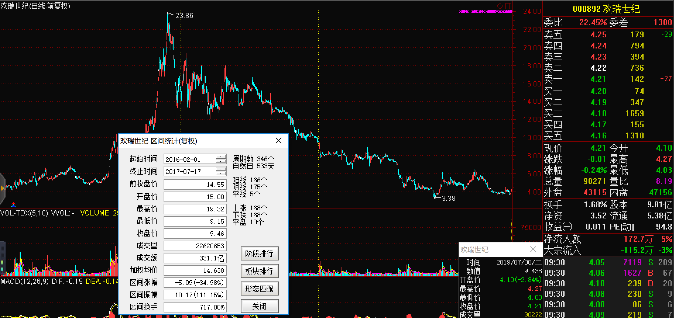 从盘面来看,2016年2月1日至2017年7月17日这段时间里,欢瑞世纪的加权均价为14.638元。区间前半截为处于震荡收敛,后半段则单边下跌。而2017年7月17日之后至今,欢瑞世纪的股价累计下跌了55%左右,股价已经回落到了4元一线,和上述的均价相比,粗略算起来,市值缩水7成,相信符合条件的账面浮亏的投资者不在少数。
