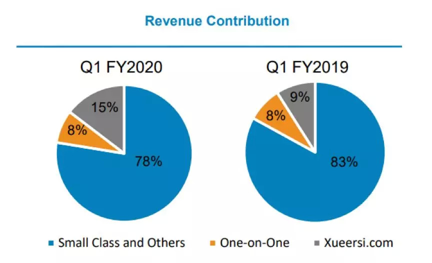 招生数据方面,总学生人次(长期正价课)由上年同期的1,221,750人增长至1,718,190人,同比增长40.6%。这一增长主要来自于更多小课班的推出以及网课的增长。公开资料显示,学而思网校的营收占比从2019财年一季度的9%上升至2020财年一季度的15%。