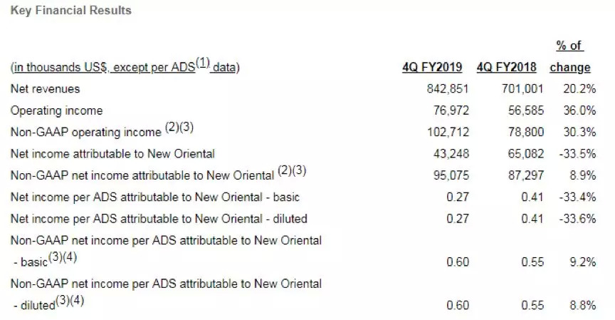 数据显示,新东方2019财年四季度实现营收约8.43亿美金,同比增长20.2%。实现经营利润、归母净利为0.77亿美金、0.43亿美金,前者同比增长36.0%,后者同比减少33.5%。不过,在非美国通用会计准则口径下,新东方四季度的归母净利润达到了0.95亿美金,同比增长8.9%。