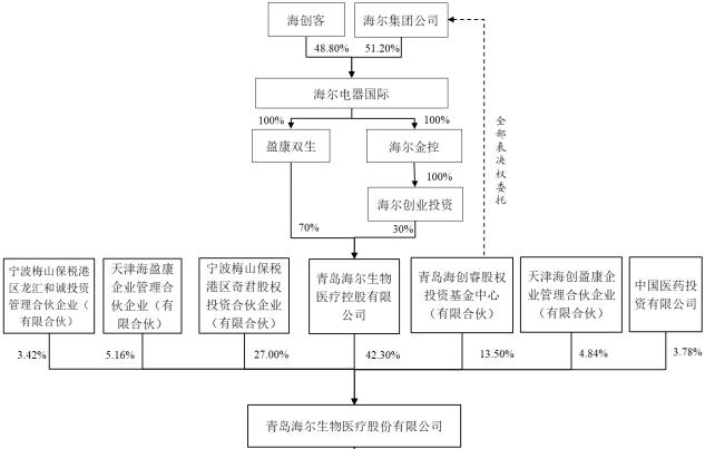海尔生物最初由海尔集团旗下的青岛海尔(600690.SH,现已更名为海尔智家)于2005年发起设立,后青岛海尔为专注白色家电业务先后于2014年和2018年向青岛海尔生物医疗控股有限公司(下称海尔医疗控股)转让股权退出。目前海尔集团通过间接控制海尔医疗控股和接受青岛海创睿股权投资基金中心(有限合伙)的委托权合计控制海尔生物55.80%股份所对应的表决权,系公司实控人。