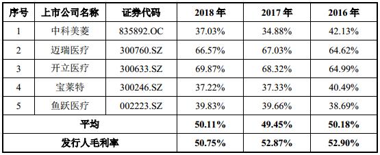 在毛利率方面,海尔生物最近三年呈现向下波动趋势。因占营业成本比重较高的原材料价格出现一定上涨,导致公司毛利率从2016年的52.90%持续下降至去年的50.75%,基本与同行可比公司相当,但高于最具可比性的中科美菱(835892.OC)近14个百分点。海尔生物对此解释称,公司具有显著的技术领先优势和更高的市场份额,产品销售定价能力更强,同时年产销量高于中科美菱,具有相对的成本规模优势。