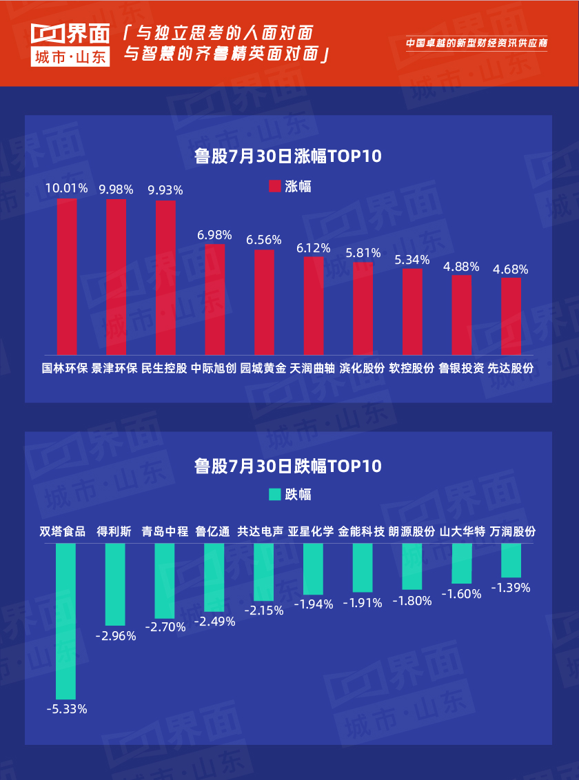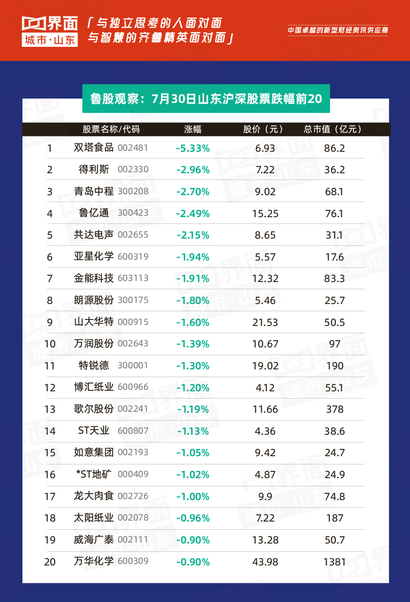 7月30日,山东省内沪深股票有136只个股看涨,54只下跌,13只与上一个交易日收盘价持平;