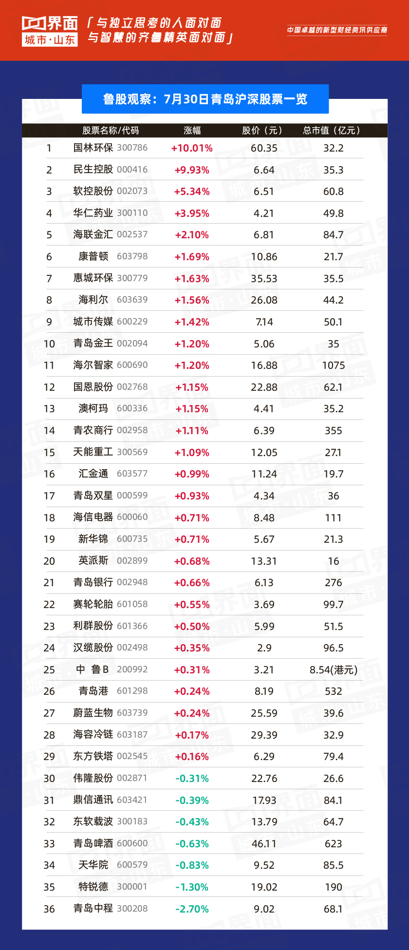 青岛市涨幅榜首:国林环保(300786),涨幅10.01%,股价60.35元,总市值32.2亿元;