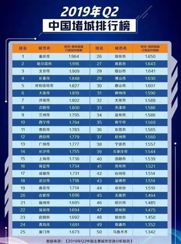 7月26日,由国家信息中心大数据发展部、中国社会科学院社会学研究所等机构共同发布的《2019年Q2中国主要城市交通分析报告》显示:全国十大堵城依次为重庆市、哈尔滨市、北京市、长春市、呼和浩特市、大连市、济南市、沈阳市、兰州市和西宁市。