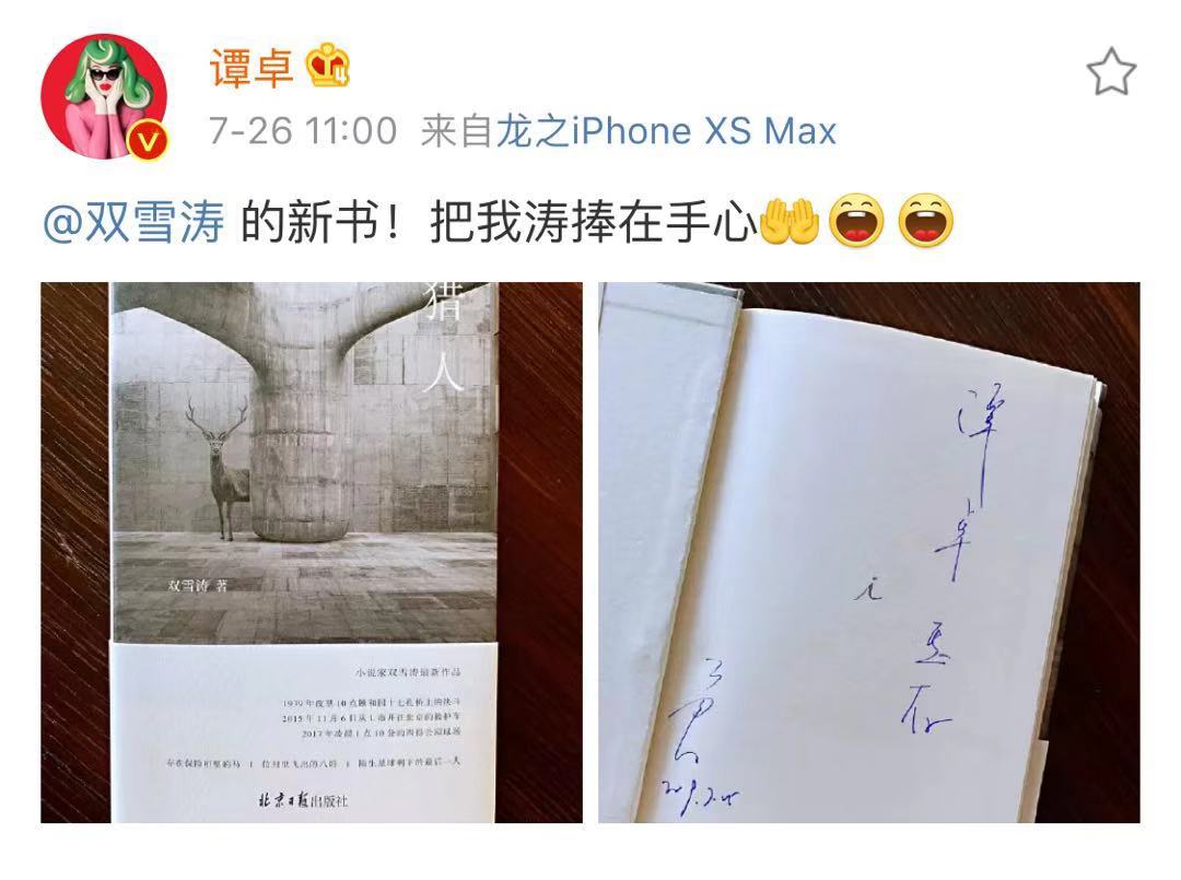 29日,谭卓在微博上分享了一首诗:猛风飘电黑云生,霎霎高林簇雨声。夜久雨休风又定,断云流月却斜明。