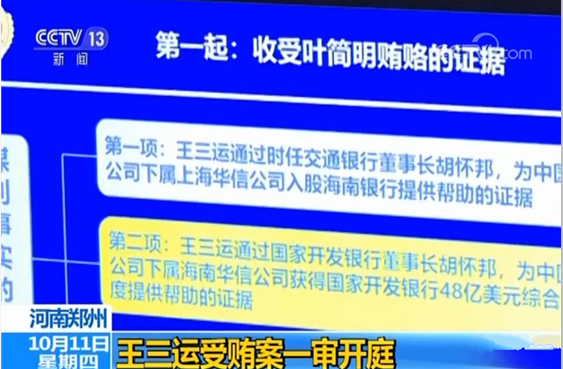 同年10月11日,央视新闻台关于前甘肃省委书记王三运受贿案的报道中出现了胡怀邦的名字。根据央视公布的庭审画面显示,包括两项证据,具体为一是王三运通过时任交通银行董事长胡怀邦,为上海华信入股海南银行提供帮助的证据,二是王三运通过国家开发银行董事长胡怀邦,为中国华信下属海南华信获得国开行48亿美元综合信贷额度提供帮助的证据。目前尚不知道这两个犯罪指控的具体内容。海南银行成立于2015年8月,上海华信和交通银行都是发起人之一,分别持股12%和10%。