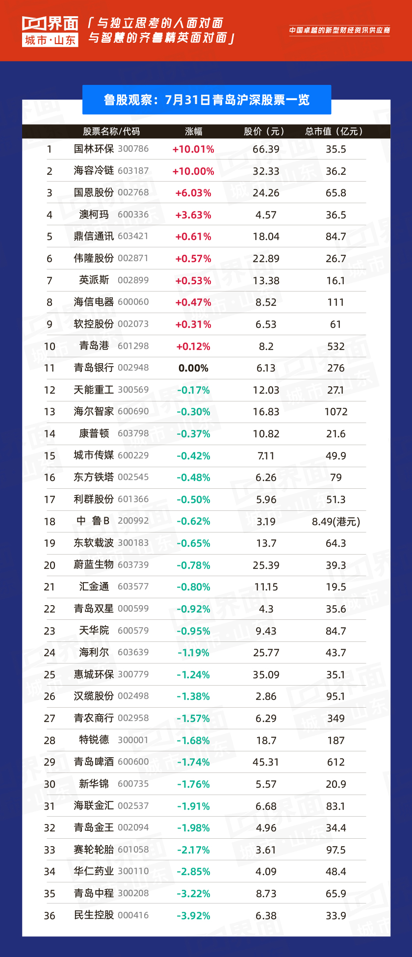 青岛市涨幅榜首:国林环保(300786),涨幅10.01%,股价66.39元,总市值35.5亿元;