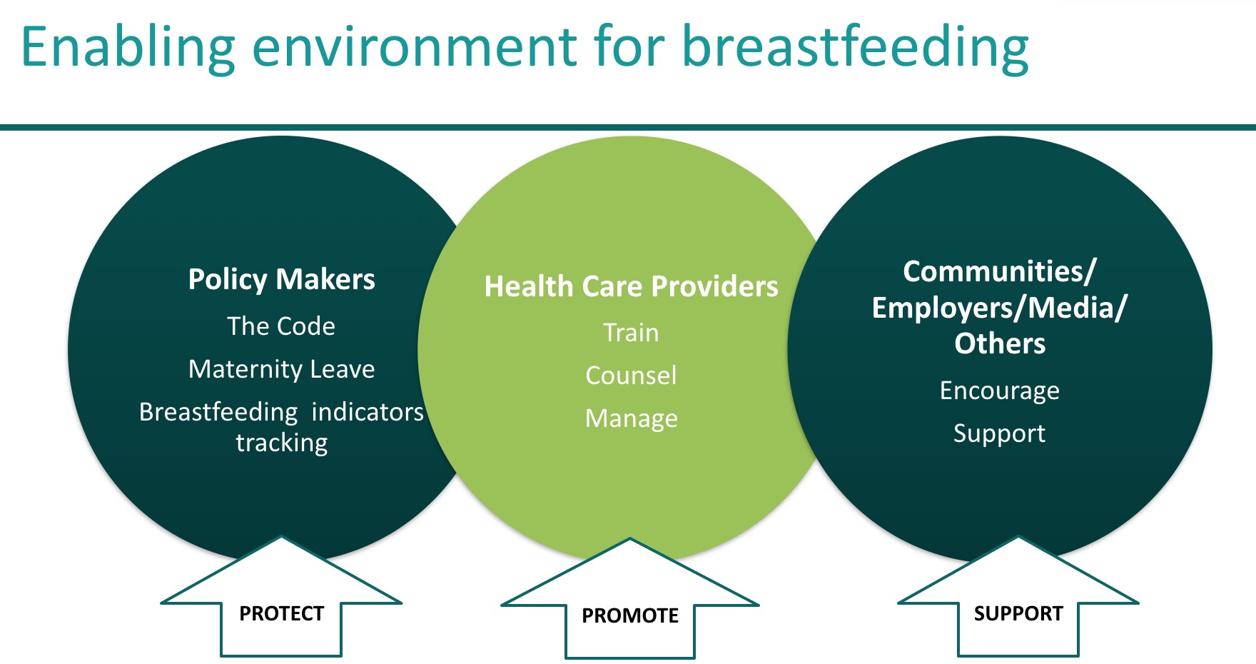 有证据表明,母乳喂养对婴儿及母亲都会带来健康益处,母乳喂养在婴儿出生的头六个月尤为重要,能够有助于预防腹泻和肺炎这两大婴儿致死性疾病。对于母亲来说,进行母乳喂养的母亲患卵巢癌和乳腺癌的风险会相应降低。根据医学杂志《柳叶刀》2016年发布的一项报告显示,在中高等收入国家,母乳喂养可以减少儿童成年之后的超重和糖尿病患病率。