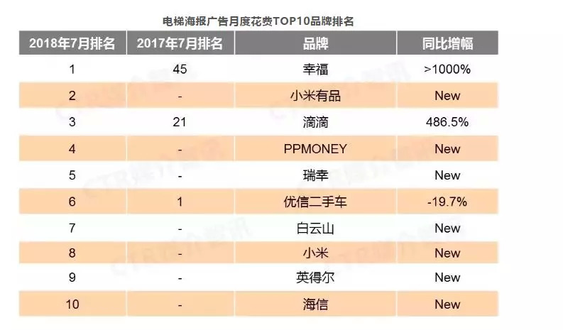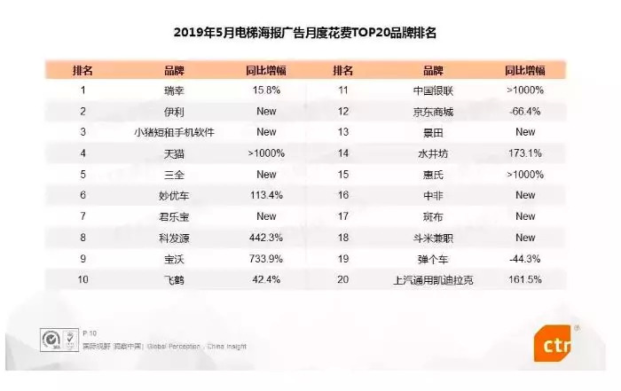 2018年7月和2019年5月电梯海报广告客户排行(摘自CTR)
