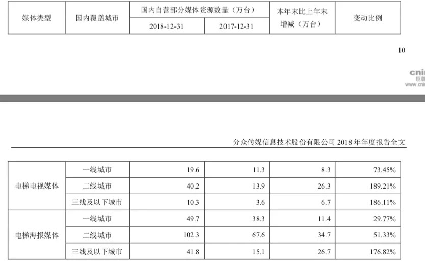 可以比较清楚看到,截至到目前,一线和二线仍然是分众主要资源所在,虽然三线及以下电梯海报媒体同比增加了176.8%之多,但绝对值仍然相对较小,大盘仍然在一二线城市。