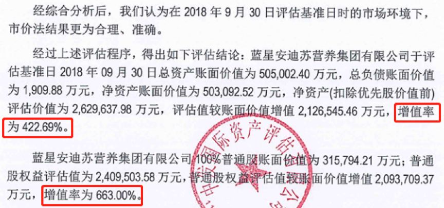 2019年1月公司发布公告,拟以36.14亿元现金收购蓝星集团持有的安迪苏营养集团15%的普通股股权,收购完成后公司将持有安迪苏营养集团100%的普通股股权。此次收购采用市价法估值,2018年9月30日评估基准日15%普通股账面价值为4.74亿元,评估价值较账面价值评估增值约31.40亿元,增值率为663.00%。