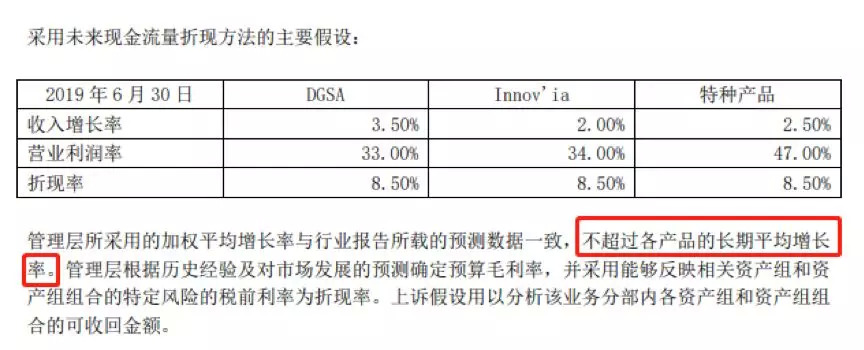 经查年报,从2015年至2019年6月30日,公司在进行商誉减值测试时,一直保持使用相同的收入增长率。尽管功能性产品收入近几年处于下滑趋势,但在减值测试中假定的未来收入增长率均为3.50%,与实际情况存在明显偏差。