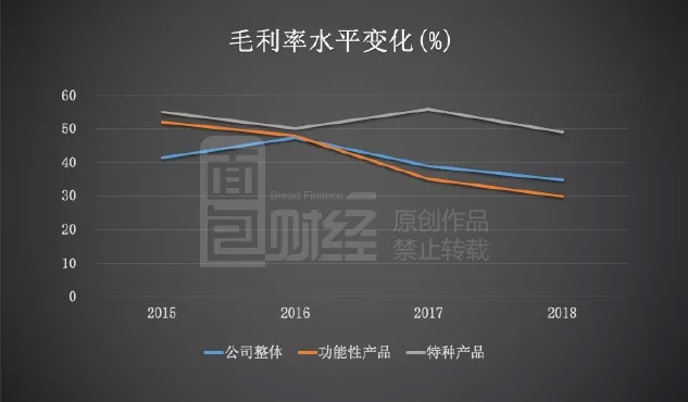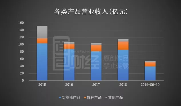 功能性产品是公司营业收入的第一大支柱,但从2015年开始,功能性产品的经营业绩开始出现下滑,营业收入由2015年的103.11亿元,降至2018年的84.96亿元,占去年总营业收入的74.4%。
