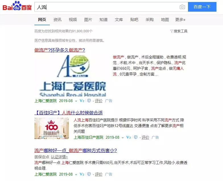 如果大家了解我们中国伟大的搜索引擎百度,就会知道,对于一些医院,尤其是我们所说的“莆田系医院”,它会出现在搜索界面的最上方。