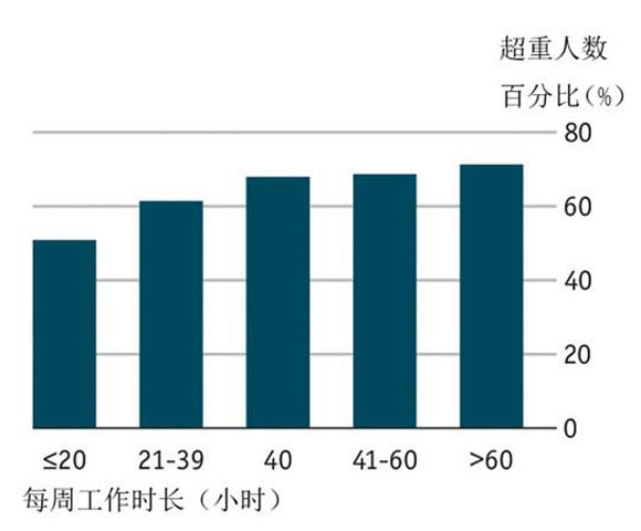 对于室内办公族来说,每周加班10小时会带来体质指数(评估体重与身高比例的参考指数,计算公式为体重除以身高的平方。国际上一致上公认18至25之间为健康的体质指数标准)增加:女性增加0.4,男性增加0.2。简单来说,就是一周加班10小时,女性约胖2.3斤,男性约胖1.3斤。