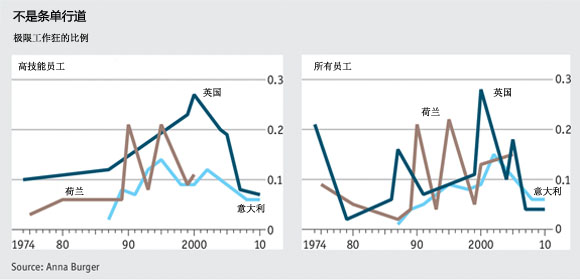 来自中欧大学(the Central European University)的Anna Burger提供了一些有趣的发现。上图清楚地表明,上世纪80年代以来,极端的工作强度越来越受欢迎,尤其在那些受过高等教育的员工中。比如常被认为是合理工作避风港的荷兰,每周辛苦工作超过50小时的全职员工比例近十年也大增(见下图)。