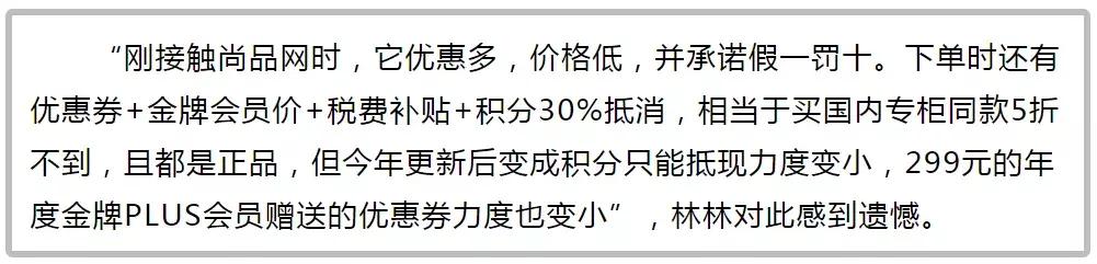 “刚接触尚品网时,它优惠多,价格低,并承诺假一罚十。下单时还有优惠券+金牌会员价+税费补贴+积分30%抵消,相当于买国内专柜同款5折不到,且都是正品,但今年更新后变成积分只能抵现力度变小,299元的年度金牌PLUS会员赠送的优惠券力度也变小。”