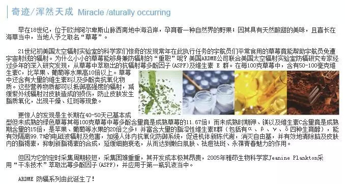 如在雅顿国际(西安)生物科技发展有限公司官网,关于其“草莓防辐射乳液”的科技成分是如此描述的:“21世纪初美国太空辐射实验室的科学家们惊奇的发现常年在此执行任务的宇航员们平常食用的草莓竟能帮助宇航员免遭宇宙射线的辐射……2005年雅茚生物科学家Jeanine Plankton采用‘干冻技术’萃取出莓多酚因子(ASPF),并应用于第一瓶乳液当中。ARDME防辐系列由此诞生了。”撇开其充满“传奇”色彩的故事不谈,霜淇淋在国家药监局非特备案平台上搜索该品名时,并未看到相关备案信息。