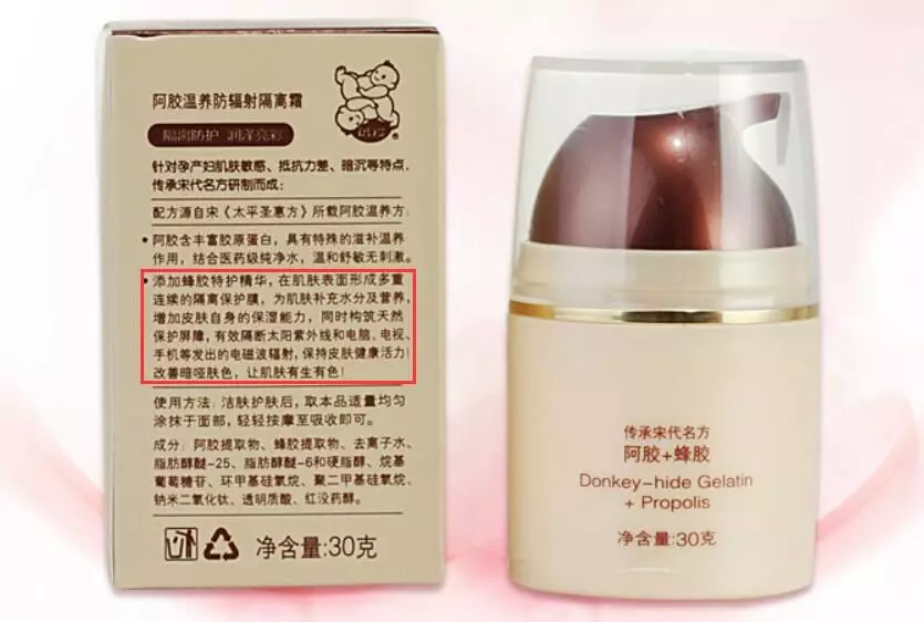 另外,针对孕妇群体的专用化妆品,也爱宣称“防辐射”。其中,一款名为“蓓爱阿胶温养防辐射隔离霜”的产品,宣称“添加蜂胶特护精华,在肌肤表面形成多重连续的隔离保护膜……有效隔断太阳紫外线和电脑、电视、手机等发出的电磁波辐射”。但霜淇淋在国家药监局非特备案平台上搜索该品名时,并未看到相关备案信息。