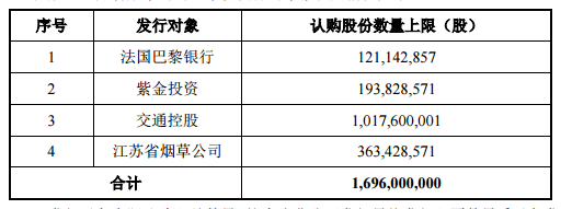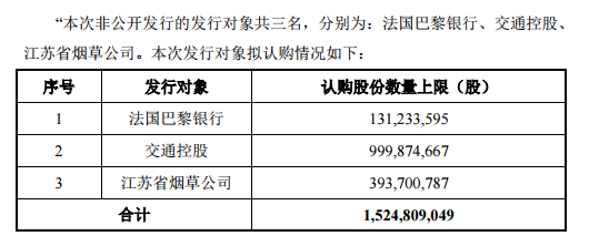 具体而言,新方案最终拟参与定增的仅有法国巴黎银行、江苏交通控股有限公司(下称“江苏交控”)和中国烟草总公司江苏省公司(下称“江苏烟草”)三家企业,认购上限分别约为1.31亿股、10亿股、3.94亿股,共计不超过约15.25亿股,募集资金总额不超过116.19亿元。