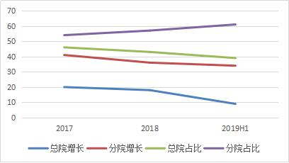 2、浙江省仍是公司业务最为核心区域,区域分院比重持续提升。