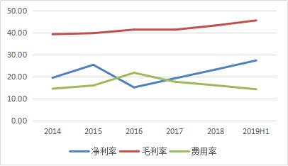 从盈利能力来看,由于营业成本增长低于营收增幅,公司毛利率稳中有升,今年上半年为45.60%,同比增加近4个百分点,而费用率则自2016年达到近22%后持续下降14.28%,这也推动公司净利率创下历史新高,今年上半年达到27.39%,同比增加超6个百分点。
